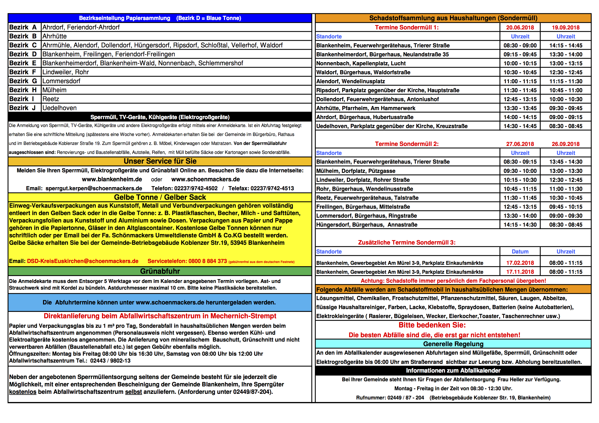 Wer auf diesem Wege keinen Abfuhrplan für das kommende Jahr erhalten hat oder eine zusätzliche Übersicht benötigt, kann sich den Kalender auch unte folgendem Link ausdrucken: Abfuhrkalender Gemeinde Blankenheim 2018