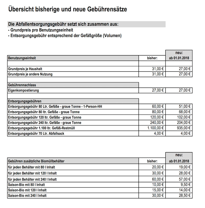 Die Berechnung für das Jahr 2018 hat ergeben, dass die Abfallentsorgungsgebühren zum 01.01.2018 gesenkt werden können. Die Absenkung der Gebühren beträgt durchschnittlich 17,08 %.