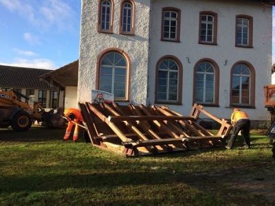 Bei genauerer Begutachtung der Überdachung waren aber erhebliche Schäden am Fundament festgestellt worden: die in den Boden eingelassenen Balken waren nahezu vollständig weggefault, so dass aus Verkehrssicherheitsgründen dringender Handlungsbedarf bestand und die Konstruktion in den letzten Wochen notdürftig abgesichert worden war.