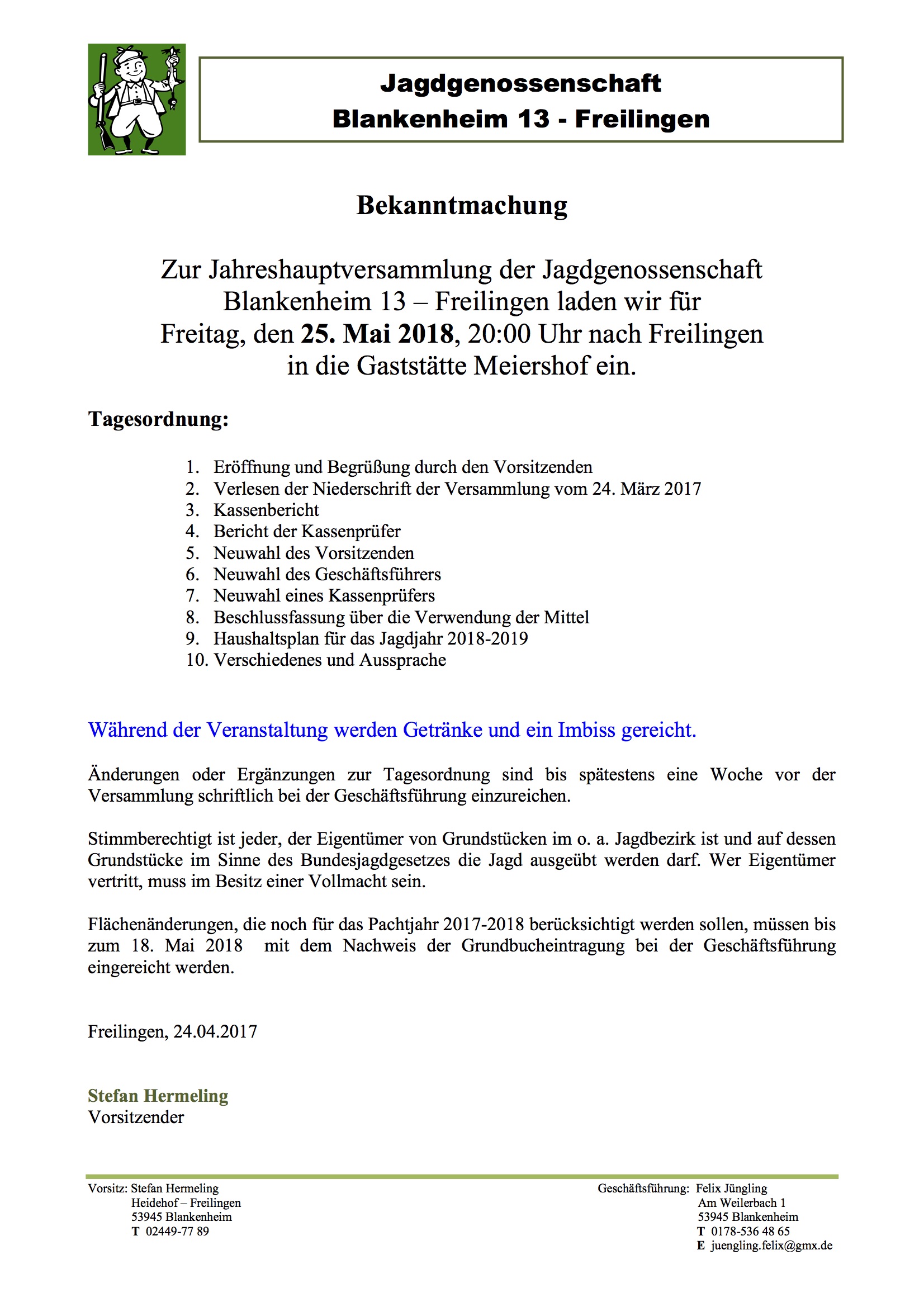 Zur diesjährigen Jahreshauptversammlung der Jagdgenossenschaft Blankenheim 13 - Freilingen am Freitag, 25. Mai 2018 um 20.00 Uhr lädt der Vorsitzende, Stefan Hermeling alle Jagdgenossen in die Gaststätte Meiershof in Freilingen ein. Auf der Tagesordnung stehen u.a. die Beschlussfassung über die Mittelverwendung und der Haushaltsplan für das Geschäftsjahr 2018/2019.