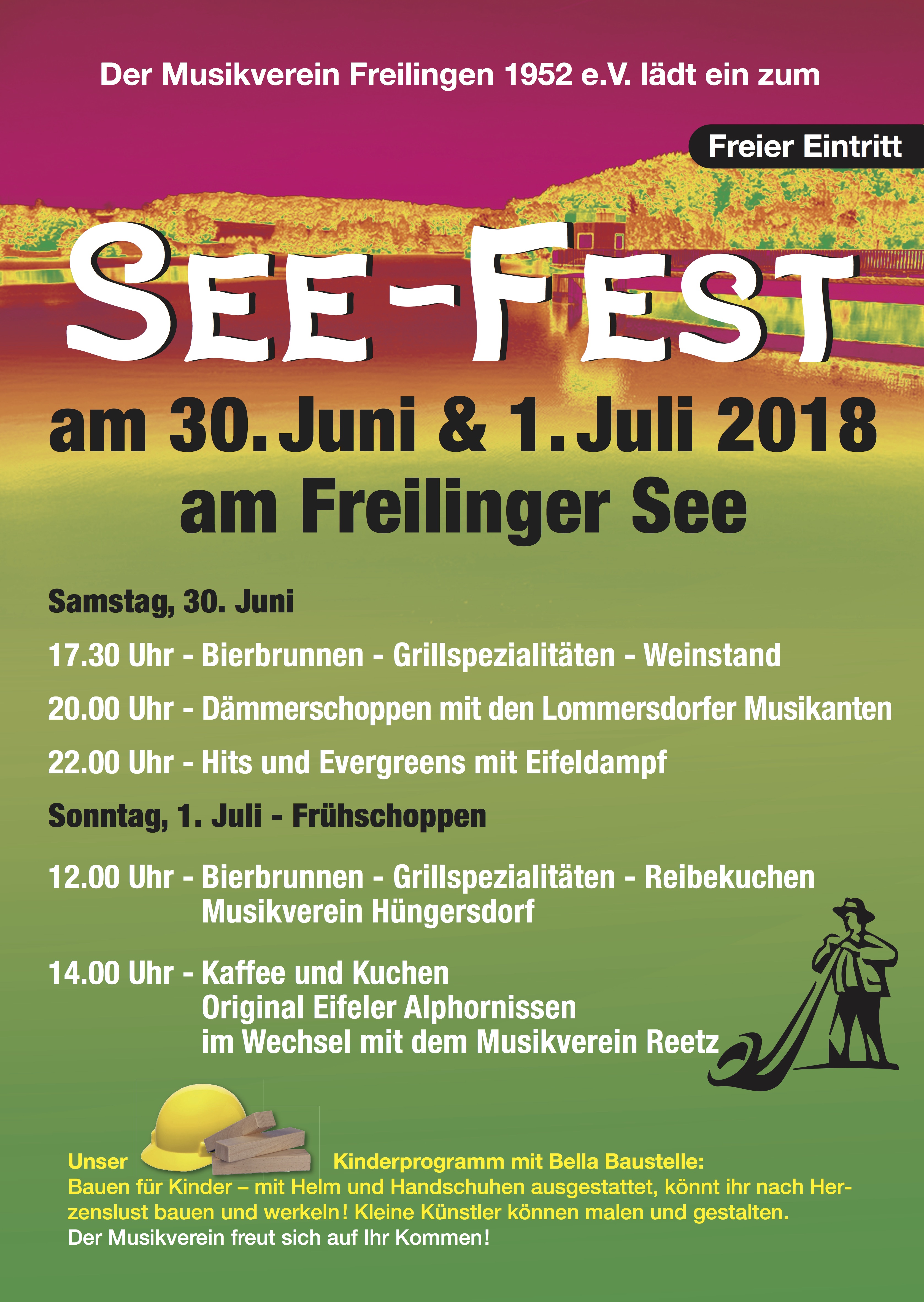 "It's See-time"... Der Musikverein Freilingen 1952 e.V. veranstaltet am 30. Juni und 1. Juli 2018 bereits zum 42. Mal das Seefest am Freilinger See. Auf dem Programm stehen nehmen den gewohnten kulinarischen Genüssen auch wieder gute Musik und eine schöne Atmosphäre am idyllisch gelegenen Freilinger See.