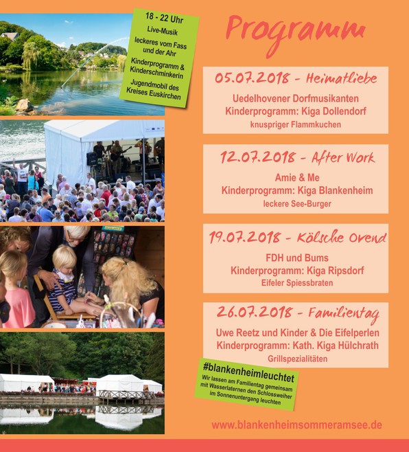 Blankenheim Sommer am See - bereits zum 13. Mal kann man in diesem Jahr an allen vier Donnerstagen im Juli, jeweils von 18.00 Uhr bis 22.00 Uhr Live-Musik und kulinarische Köstlichkeiten an der Weiheranlage in Blankenheim genießen. Im Angebot sind auch wieder ein Kinderprogramm, das u.a. von den Kindergärten aus der Gemeinde gestaltet wird und natürlich FDH & Bums, auf die man sich am 19. Juli freuen kann.