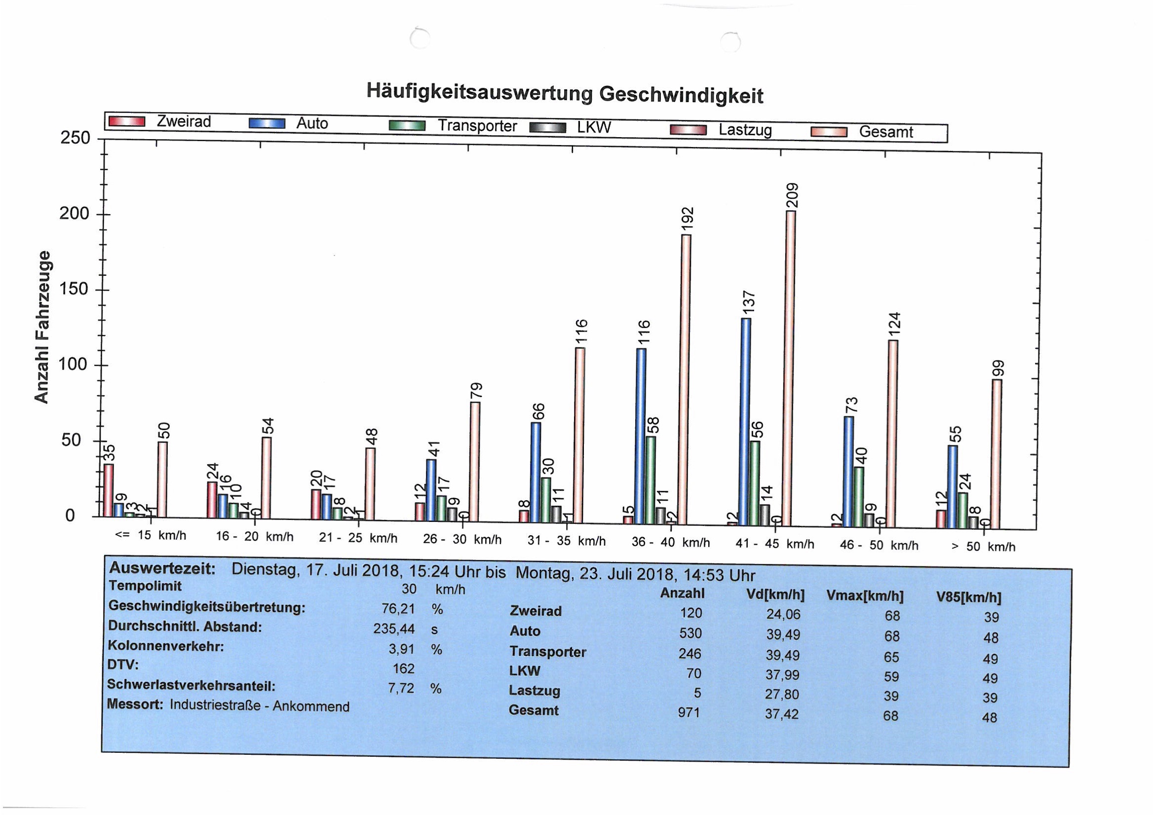 Von Dienstag, 17. Juli bis Montag, 23. Juli 2018 war das Messgerät im Bereich der Ortseinfahrt in der Industriestraße im Einsatz.