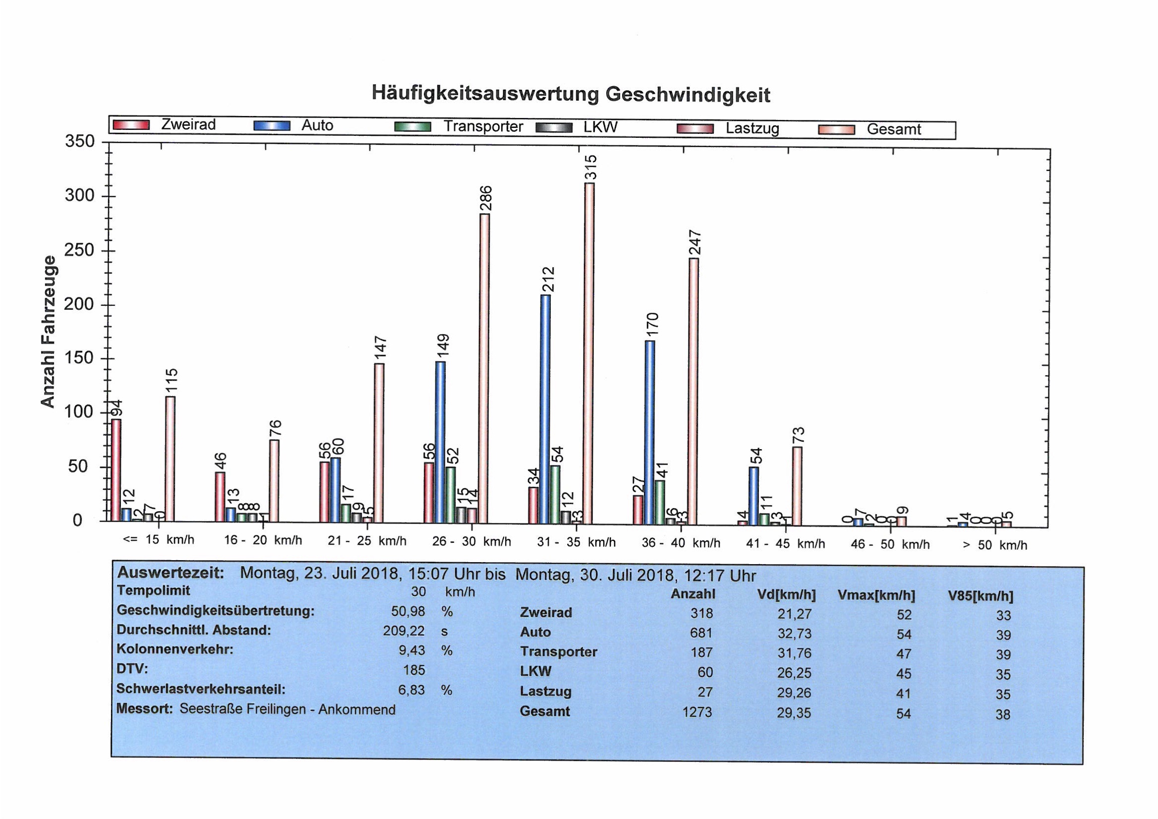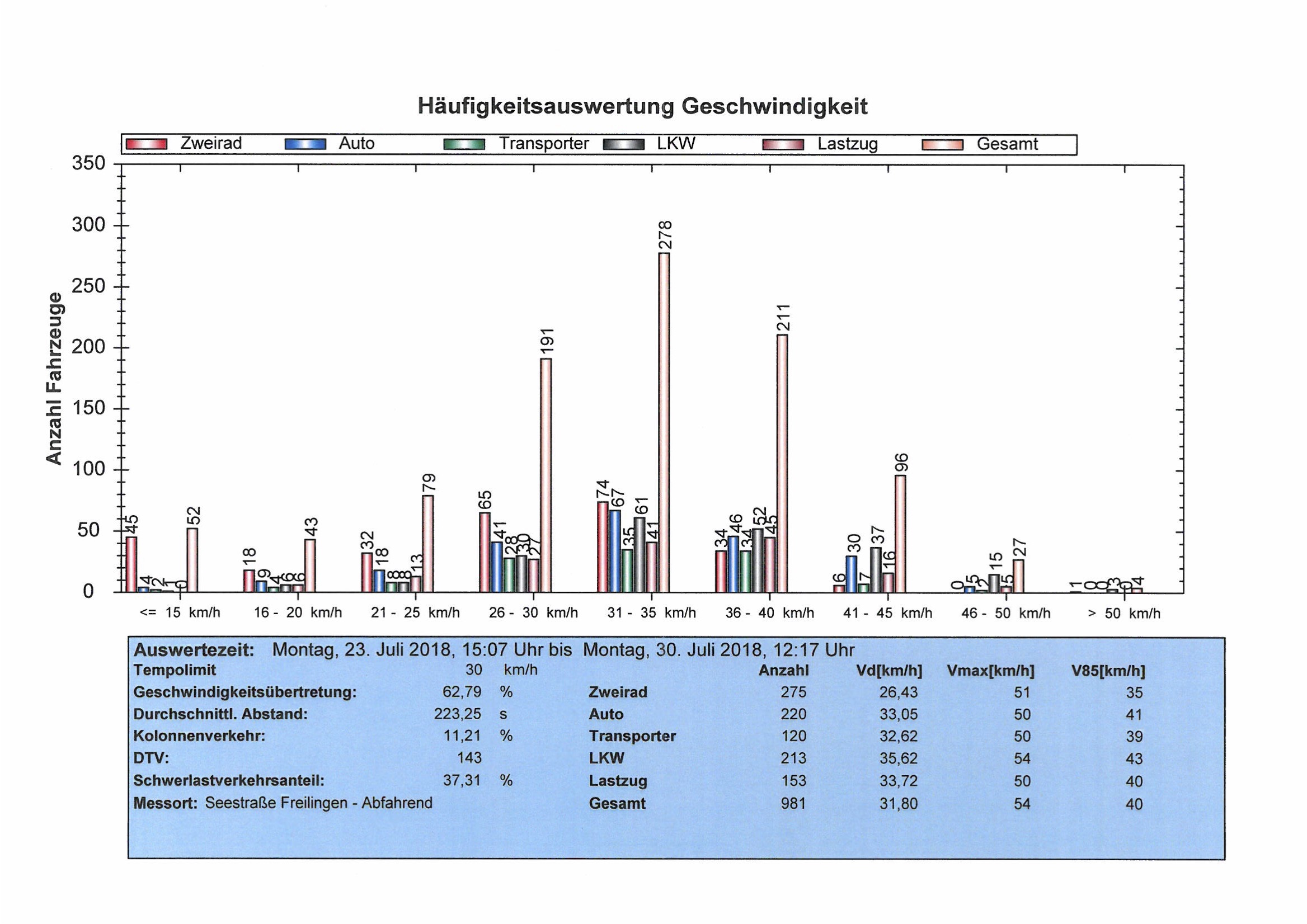In der Seestraße wurde von Montag, 23. Juli bis Montag, 30. Juli 2018 gemessen, und zwar der einfahrende als auch der aus der Seestraße herausfahrende Verkehr.