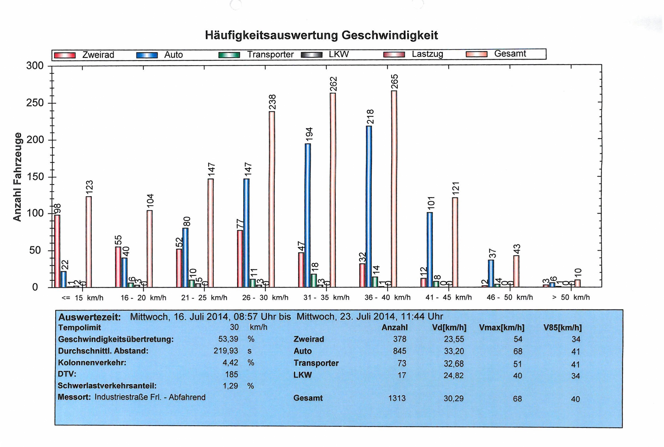 Insgesamt wurden 76,21 % bzw. 53,39 % Geschwindigkeitsübertretungen festgehalten. Auffällig ist hier, dass die Gesamtmenge des abfahrenden Verkehrs zwar mit 1313 Fahrzeugen die höchste der insgesamt gemessenen Verkehre ist, der ankommende Verkehr hier aber sogar niedriger ist, als der in der Seestraße ankommende Verkehr. Wesentlich ist in jedem Fall, dass der aus der K41 auf die Industriestraße einbiegende Verkehr in jedem Fall eine deutlich überhöhte Geschwindigkeit aufweist.
