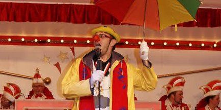 "Ne Jeck im Rähn" alias Björn Wassong aus Mechernich-Weyer, Vorsitzender der „Weyerer Blömche“, ist seit elf Jahren as in der Bütt. Dafür braucht er ein rundes Hütchen mit bunten Punkten, einen gelben „Ostfriesenerz“, eine weiße Hose mit „blauen Regentropfen“ und einen bunten Schirm.