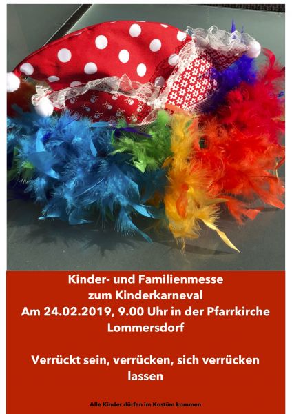 "Kostüme ausdrücklich erwünscht..." - heißt es am Sonntag, 24. Februar in der Pfarrkirche in Lommersdorf bei der Kinder- und Familienmesse zum Karneval. Unter dem Motto "Verrückt sein, verrücken, sich verrücken lassen" wird um 9.00 Uhr ein ganz besonderer Gottesdienst gefeiert. Nicht verpassen!