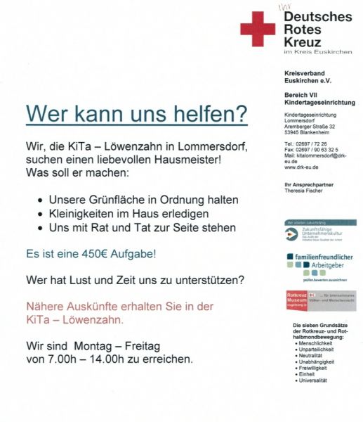 Wer kann helfen? - die KiTa Löwenzahl in Lommersdorf sucht jemanden für die Erledigung von kleineren Hausmeisterarbeiten.