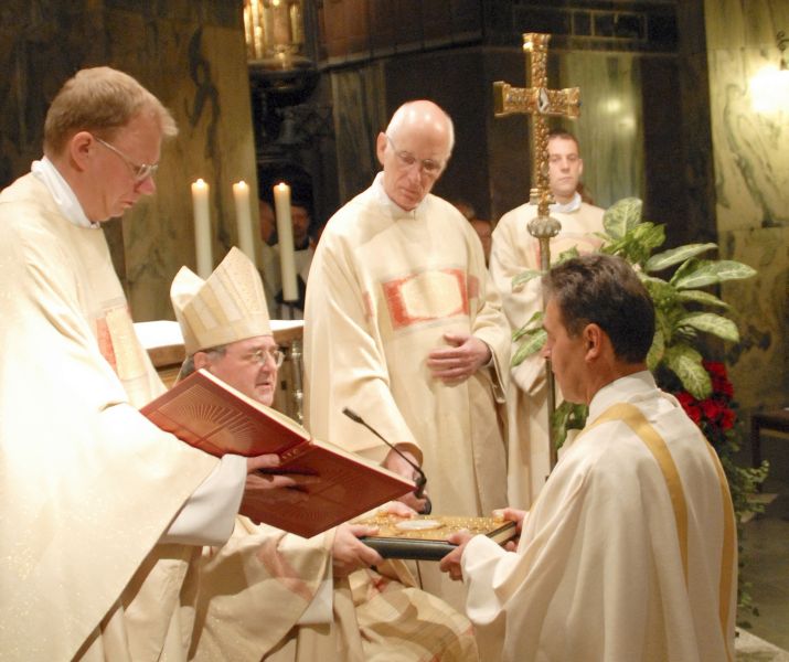 (Diakonenweihe: 20. Juni 2009: Der frischgeweihte Diakon Erich Schmitz nimmt das Evangeliar und damit den Auftrag, das Evangelium Jesu Christi zu verkündigen, aus den Händen seines Bischofs Heinrich entgegen. Der einst selbständige Unternehmer trat mit dem Ruhestand in den Klerus ein und wollte als Ständiger Diakon im Zivilberuf neben seiner geliebten Familie ganz Mann Gottes und der Kirche sein. Archivfoto: Manfred Lang/pp/Agentur ProfiPress)