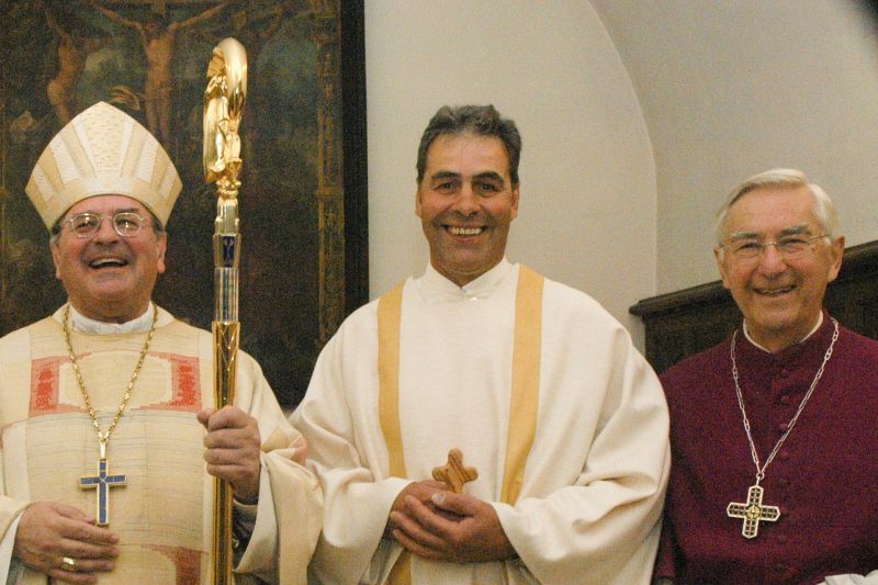 (Strahlend vor Glück stellte sich der neue Diakon Erich Schmitz am Tag seiner Weihe zwischen Bischof Dr. Heinrich Mussinghoff (l.) und dem Eifeler Weihbischof Karl Reger dem Fotografen in der Sakristei-Kapelle des Aachener Doms. Archivfoto: pp/Agentur ProfiPress)