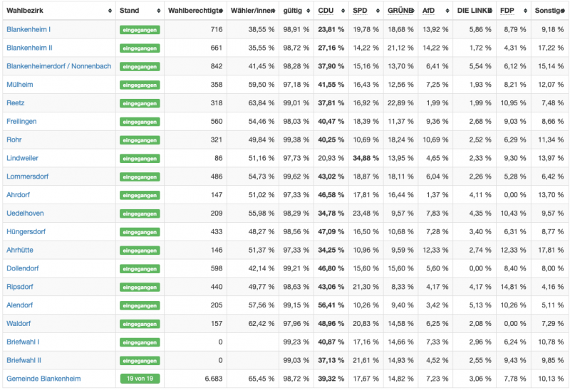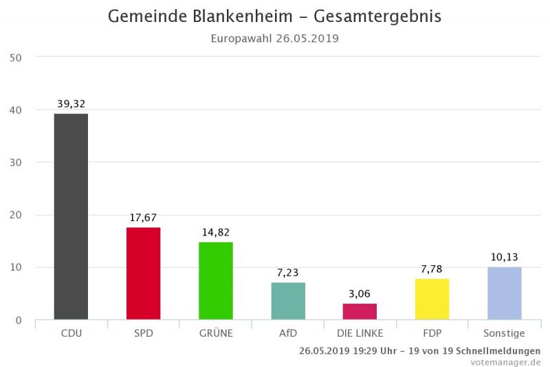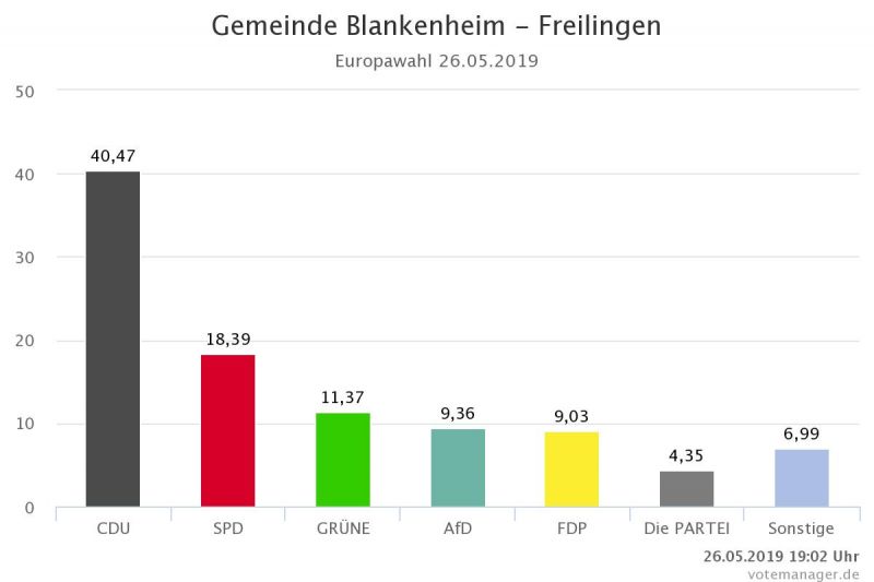 Die genaue Stimmenverteilung auch hinsichtlich der unter Sonstige gefassten Parteien kann unter folgendem Link nachgeschaut werden: Europawahl Stimmverteilung Wahlbezirk Freilingen bzw. für die gesamte Gemeinde Blankenheim .