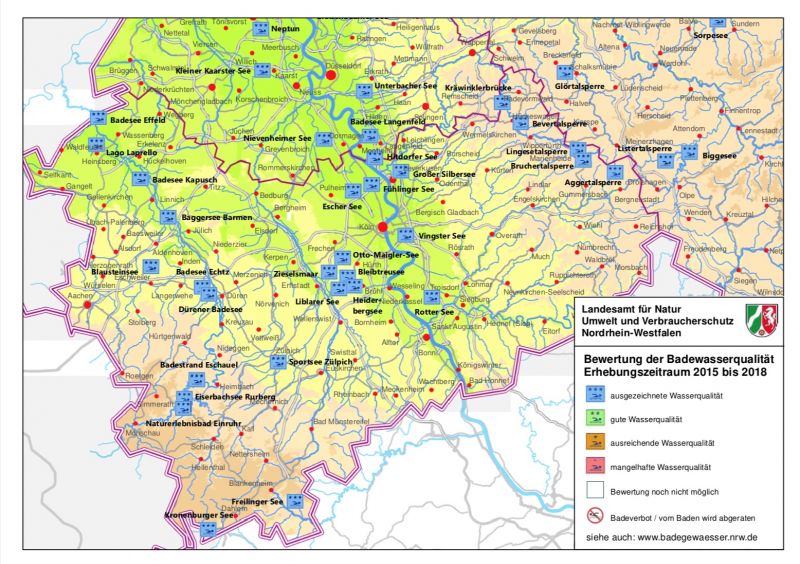 Die NRW-Badegewässer haben weiterhin eine gute bis ausgezeichnete Wasserqualität. Das zeigen die Messungen der Gesundheitsämter, die die Badegewässer an den offiziellen Messstellen in NRW regelmäßig auf ihre Wasserqualität untersuchen.