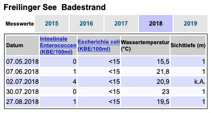 Nähere Infos zu den Ergebnissen des Freilinger Sees auch unter folgendem Link: Wasserqualität Freilinger See und allgemein zum Badegewässerprofil des Freilinger Sees unter Gewässerprofil