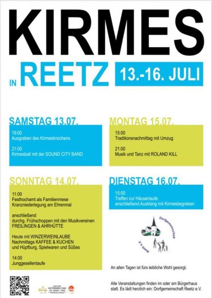 Auch im Nachbarort Reetz versteht man es, ordentlich Kirmes zu feiern. Vom 13. bis 16. Juli 2019 wird rund in und um das Bürgerhaus herum wieder ein abwechslungsreiches Programm geboten, u.a. mit dem Musikverein Freilingen, der beim sonntäglichen Frühschoppen für die musikalische Unterhaltung sorgen wird.