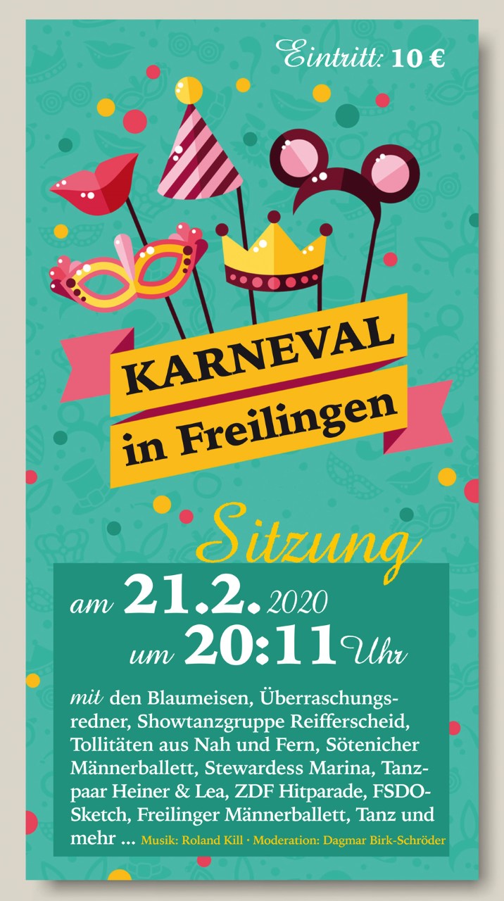 Unter der bewährten Sitzungsleitung von Dagmar Birk-Schröder wird ab 20.11 Uhr neben den traditionell auftretenden einheimischen Gruppen diesmal ein hochkarätiger Überraschungsredner auf der Freilinger Bühne präsentiert. Auch mit dabei ist die "Stewardess Marina", die uns mit an Bord der chaotischsten Airline aller Zeiten nehmen wird. Der Sitzungssaal wird zum Passagierraum und die Bühne zur Landebahn. Ein garantiert kurzweiligen Anflug auf das humoristische Zwerchfell, bei dem sicherlich kein Auge trocken bleiben wird.