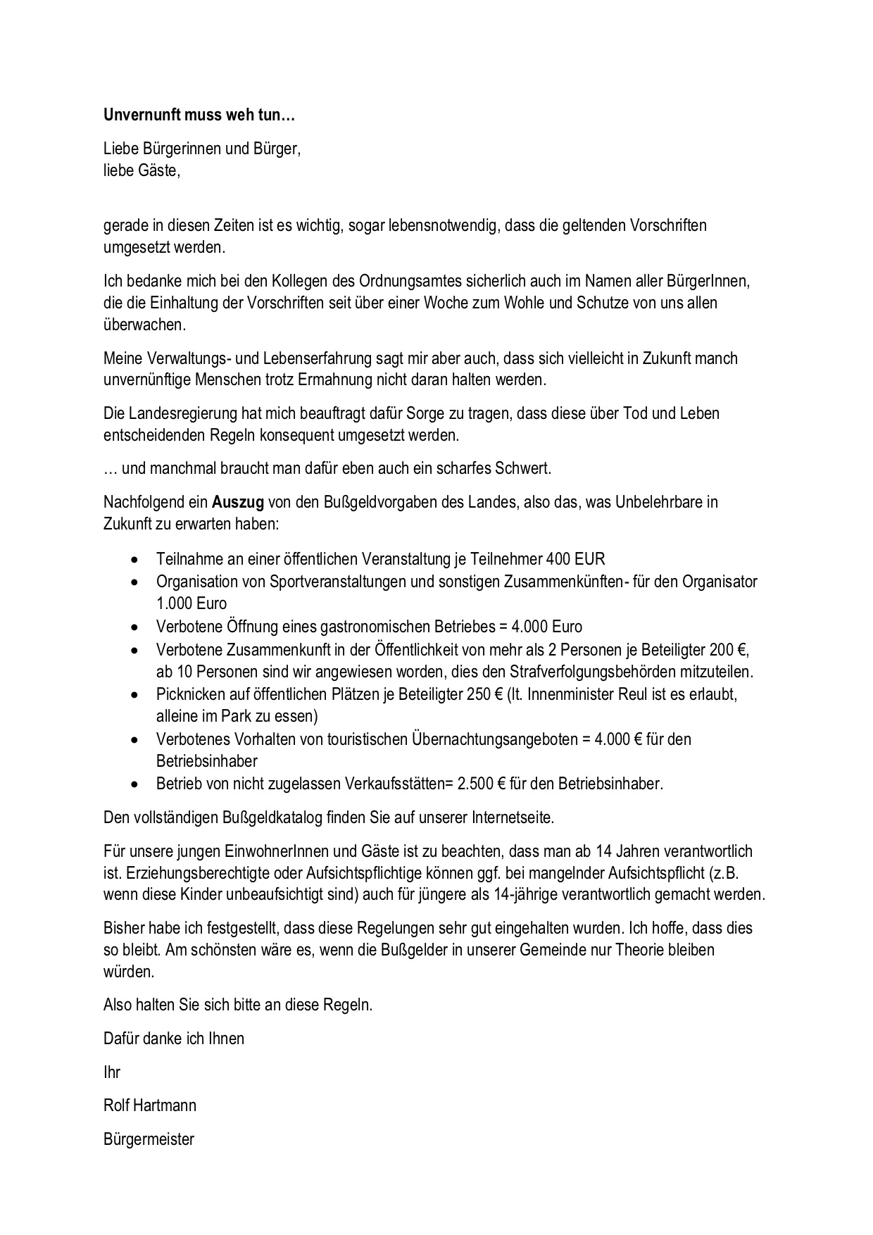 Zur Umsetzung des Kontaktverbots in Zeiten der Corona-Krise hat die Landesregierung einen Straf- und Bußgeldkatalog veröffentlicht. Grundlage dafür ist das Infektionsschutzgesetz. Hier ein Informationsschreiben des Bürgermeisters Rolf Hartmann zu den landesrechtlichen Vorgaben und der Umsetzung vor Ort, sowie der umfangreiche Straf- und Bußgeldkatalog im Überblick. Bitte beachten!