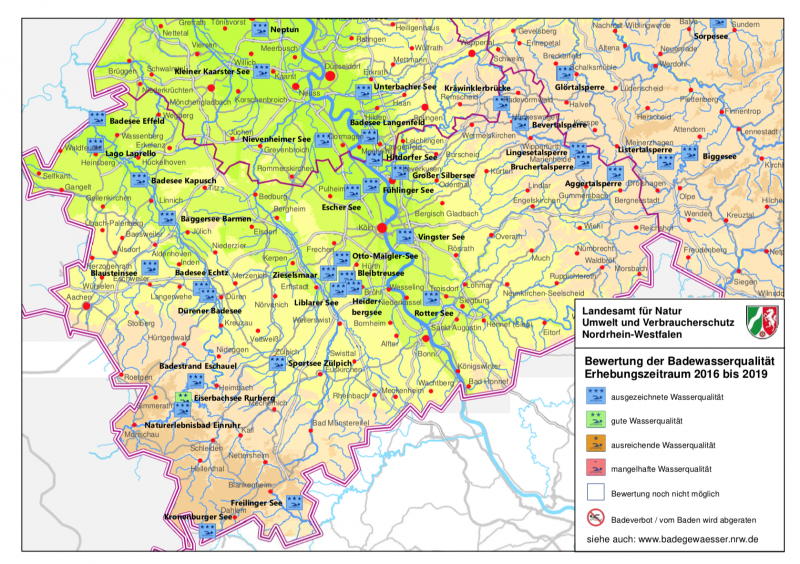 In Nordrhein-Westfalen gibt es insgesamt 83 ausgewiesene EU-Badegewässer mit insgesamt 108 Badestellen, an denen während der Badesaison regelmäßig Untersuchungen der Wasserqualität stattfinden. Nach aktuellen Daten weisen 104 Badestellen eine „ausgezeichnete“ und drei Badestellen eine „gute“ Wasserqualität auf.