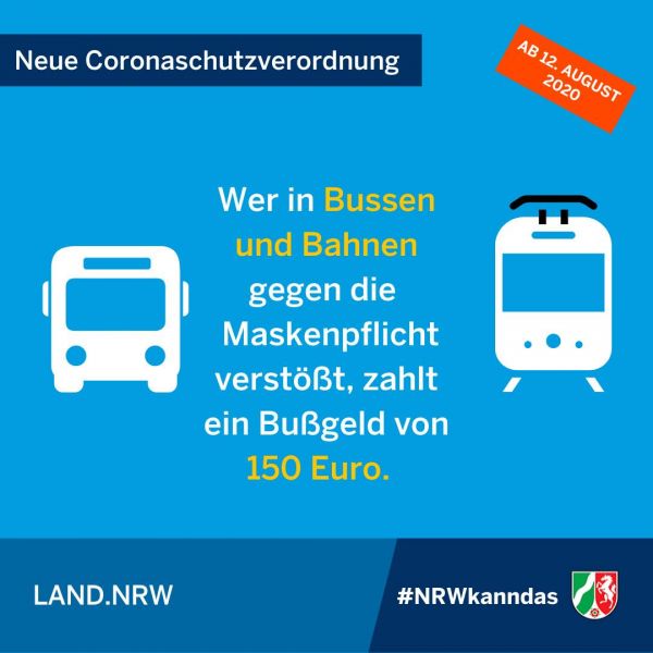 Die Coronaschutzverordnung des Landes Nordrhein-Westfalen wird bis zum 31. August 2020 verlängert und der Verstoß gegen die Maskenpflicht in öffentlichen Verkehrsmitteln als Ordnungswidrigkeit aufgenommen und geahndet.
