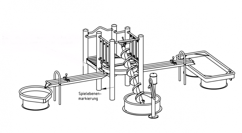 Für den Nachwuchs wird in den kommenden Wochen noch ein großer Wasserpielplatz in sicherer Entfernung zum Wasser errichtet. Im Mittelpunkt steht dabei ein Schöpfbecken mit einer Wasserspirale, die mittels einer Schwengelpumpe gefüllt werden kann. Diese saugt das Wasser aus einer Zisterne, die über eine unterirdische Leitung mit dem See verbunden ist. Die Spielanlage soll aus Sicherheitsgründen ca. 6 m vom Seeufer und der dort geplanten Flachwasserzone entfernt errichtet werden, so dass kein direkter, offener Kontakt zum See besteht.