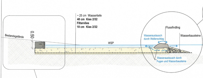 Durch die befestigte Flachwasserzone soll ein verbesserter Zugang zum Wasser erreicht werden. Dieser Bereich wird folgendermaßen angelegt: