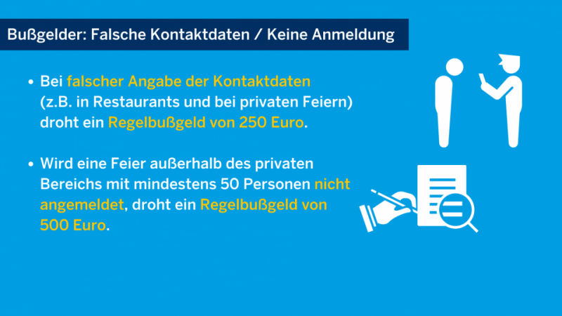 Zudem haben Bund und Länder beschlossen, die Angabe unrichtiger Kontaktdaten auf Listen, die der Rückverfolgung dienen – also etwa in Restaurants – mit einem Bußgeld zu bestrafen. In Nordrhein-Westfalen wird dazu für Gäste, die solche Falschangaben machen, ein Regelbußgeld von 250 Euro festgelegt.