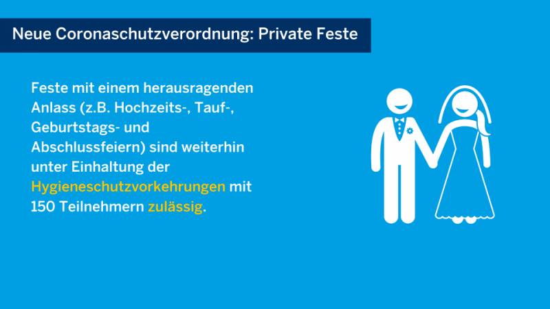 Unverändert gilt, dass solche Feierlichkeiten auf höchstens 150 Teilnehmende begrenzt sind. Für Feste Anfang Oktober gilt bezüglich der Anmeldefrist der Vertrauensschutz. Die Veranstalter sind allerdings aufgefordert, die Veranstaltungen schnellstmöglich nachzumelden. Unverändert gilt, dass solche Feierlichkeiten auf höchstens 150 Teilnehmende begrenzt sind.
