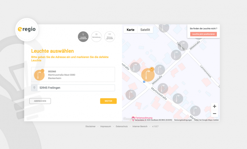 Ist es in Ihrer Straße dunkel? Kein Problem. Das kann jetzt noch schneller und einfacher gemeldet werden. Die e-regio hat das Meldesystem für dekfekte Straßenbeleuchtung technisch so vereinfacht, dass jetzt die Möglichkeit besteht, online durch einfaches Ankllicken der in einem Straßenplan der Ortschaft aufgezeigten Lampe die Störung schnell und direkt beim Servicedienst zu melden, ohne Umweg über den telefonischen Störungsdienst, die Ortsvorsteher oder die Gemeindeverwaltung. Übrigens, wussten Sie schon, dass man auch bei Gemeinde Blankenheim Mängel bzw. Schäden online melden kann?