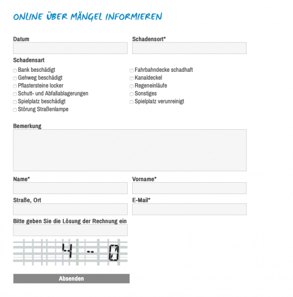 Auch hier kann durch eine Online-Meldung der Schaden etc. sofort an den zuständigen Sachbearbeiter weitergeleitet und bearbeitet werden. Einfach folgenden Link anklicken: Mängelmeldung