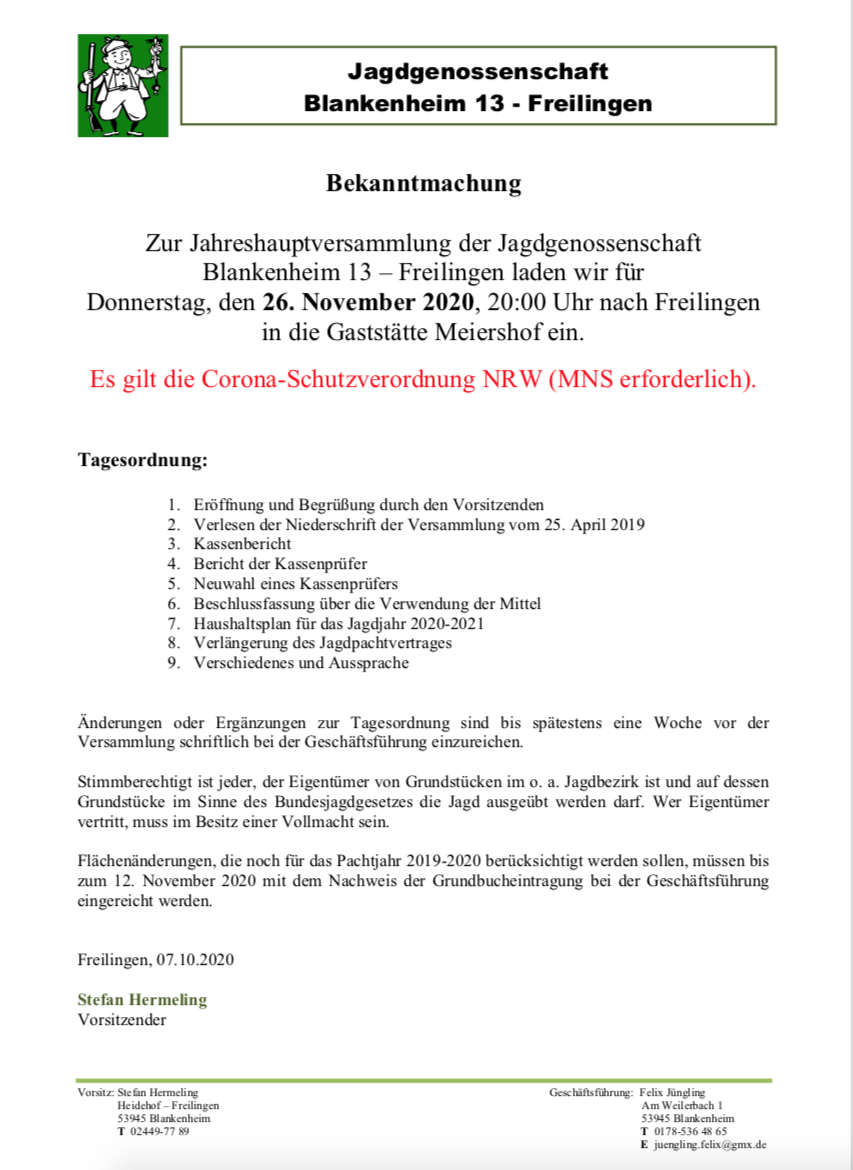 Jahreshauptversammlung der Jagdgenossenschaft Blankenheim 13 - Freilingen am Donnerstag, 26. November 2020 um 20.00 Uhr - dazu lädt der Vorsitzende, Stefan Hermeling alle Jagdgenossen in die Gaststätte Meiershof in Freilingen ein. Auf der Tagesordnung stehen u.a. die Beschlussfassung über die Mittelverwendung und der Haushaltsplan für das Geschäftsjahr 2020/2021. Natürlich werden alle Vorgaben und Bestimmungen der Corona-Schutzverordnung eingehalten.