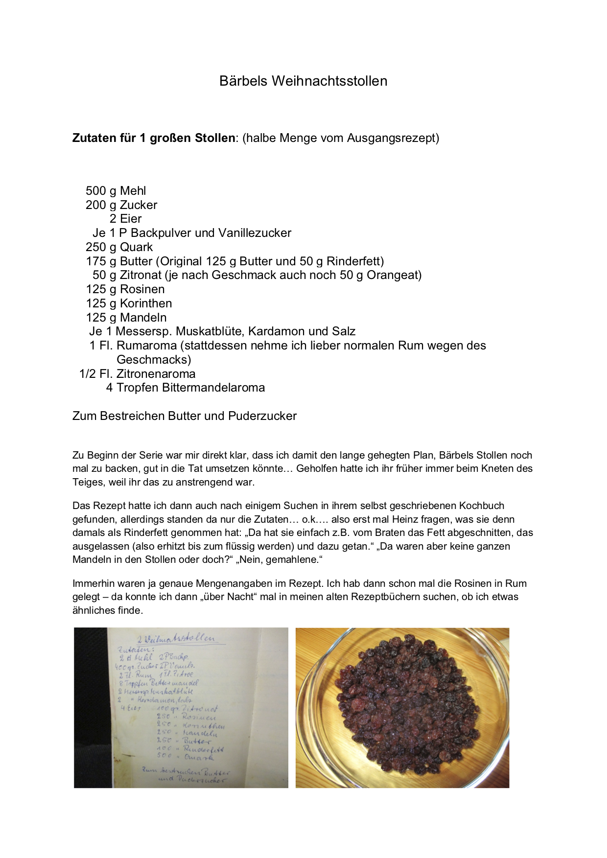 "Back" to the roots - Backen mit Rosi! - So der Titel der kleinen Serie auf WiF, mit der wir in den Wochen bis Weihnachten "einfache", aber leckere Backrezepte vorstellen wollen. Präsentiert werden die Rezepte von Roswitha Hermeling, auch Rosi genannt, die sich bestens damit auskennt. Im vierten Teil hat Rosi für uns ein altes Familien-Rezept heraus gesucht, und zwar für einen traditionelles Weihnachts-Gebäck, "Bärbels Weihnachtsstollen". Ein Rezept mit "Geschichte"...