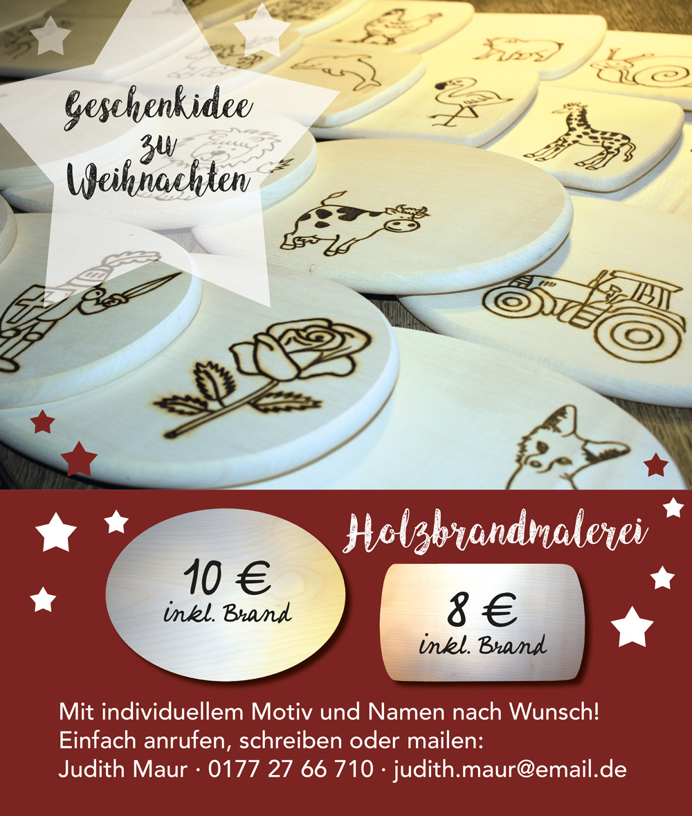 Haben Sie schon alle Weihnachtsgeschenke? - wenn nicht, haben wir einen Tipp für Sie: ein individuell gestaltetes Brettchen aus Freilingen. Judith Maur bietet ihre ganz persönlich, nach eigenem Wunsch in Holzbrandtechnik gestalteten Früstücks- bzw. Schneidebretter in der Vorweihnachtszeit eigentlch auf Weihnachtsmärkten an. Das ist ja leider 2020 nicht möglich. Daher besteht in diesem Jahr die Gelegenheit, die kleinen hölzernen Kunstwerke bei ihr direkt zu bestellen. Regional und nachhaltig :)
