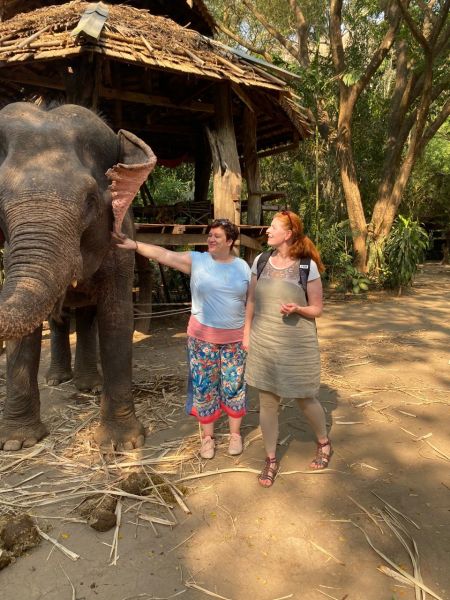 Nach 35 Jahren innigster Freundschaft mit Judith haben wir es 2020 tatsächlich erstmalig geschafft, einen geeigneten Zeitpunkt für eine „Freundinnen-Reise“ zu finden. Wir einigten uns schnell auf Thailand und waren uns sicher, dass wir einen Mix aus Kultur, Natur und Entspannung wollten. Jede Menge Natur erlebten wir während unserer Tage am berühmten River Kwai in einer Lodge mitten im Dschungel. Unser persönlicher Guide Simon führte uns zu paradiesischen Orten und während einer kleinen Wanderung stand plötzlich diese wunderschöne Elefantendame um die Ecke. Sie war das Dorftier und früher hart arbeitend im Einsatz, aber aufgrund ihres Alters wird sie jetzt nur noch verwöhnt. Die Begegnung war definitiv ein Glücksmoment!