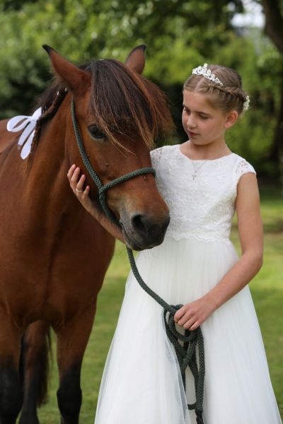 Mein persönlicher Glücksmoment hat am 30.08.2020 an meiner 1. Hl. Kommunion auf dem Dorfplatz in Freilingen stattgefunden. Nachdem ich endlich den langersehnten Leib Christi zum ersten Mal empfangen und probieren durfte wurde ich nach der Hl. Messe von meinen Reitfreunden total überrascht. Gemeinsam mit meiner Reitlehrerin ging ich auf die Straße Richtung Feuerwehrhaus und da erblickte ich sie schon. „Mein“ Pferd kam mit weißer Schleife in der Mähne auf mich zugeritten !!! Ich war überglücklich und sprachlos.
