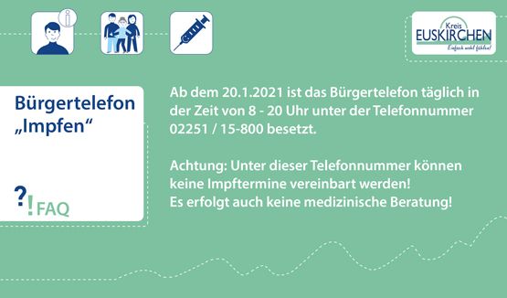 Der Kreis Euskirchen hat ab Mittwoch, 20. Januar ein Bürgertelefon eingerichtet. Wer Fragen zum Impfen hat, kann sich täglich von 8 bis 20 Uhr unter Tel. 02251 / 15-800 melden. Fragen können auch per E-Mail unter Diese E-Mail-Adresse ist vor Spambots geschützt! Zur Anzeige muss JavaScript eingeschaltet sein!gestellt werden.