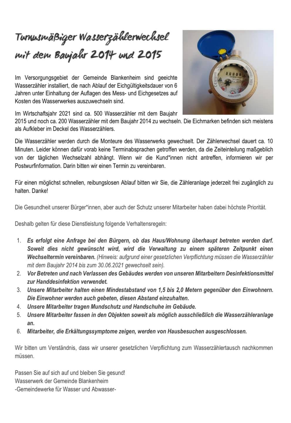 In den kommenden Wochen werden im Versorgungsgebiet der Gemeinde Blankenheim turnusmäßig Wasserzähler ausgewechselt, die aus dem Jahren 2014 und 2015 stammen und damit aufgrund der Eichgültigkeitsdauer von 6 Jahren als Wiederbeglaubigungsjahr 2021 aufweisen. Betroffen vom Wasserzählerwechsel sind in diesem Jahr ca. 500 Zähler in der Gemeinde.