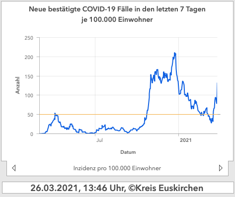 Der Kreis Euskirchen zählt zu den Kreisen, in denen die Inzidenz an mehr als drei Tagen über 100 gelegen hat, da auch hier seit dem 23. März die Schwelle überschritten wurde (Stand 26.03.2021: Inzidenz 132,7; Tendenz seit Tagen stark steigend).