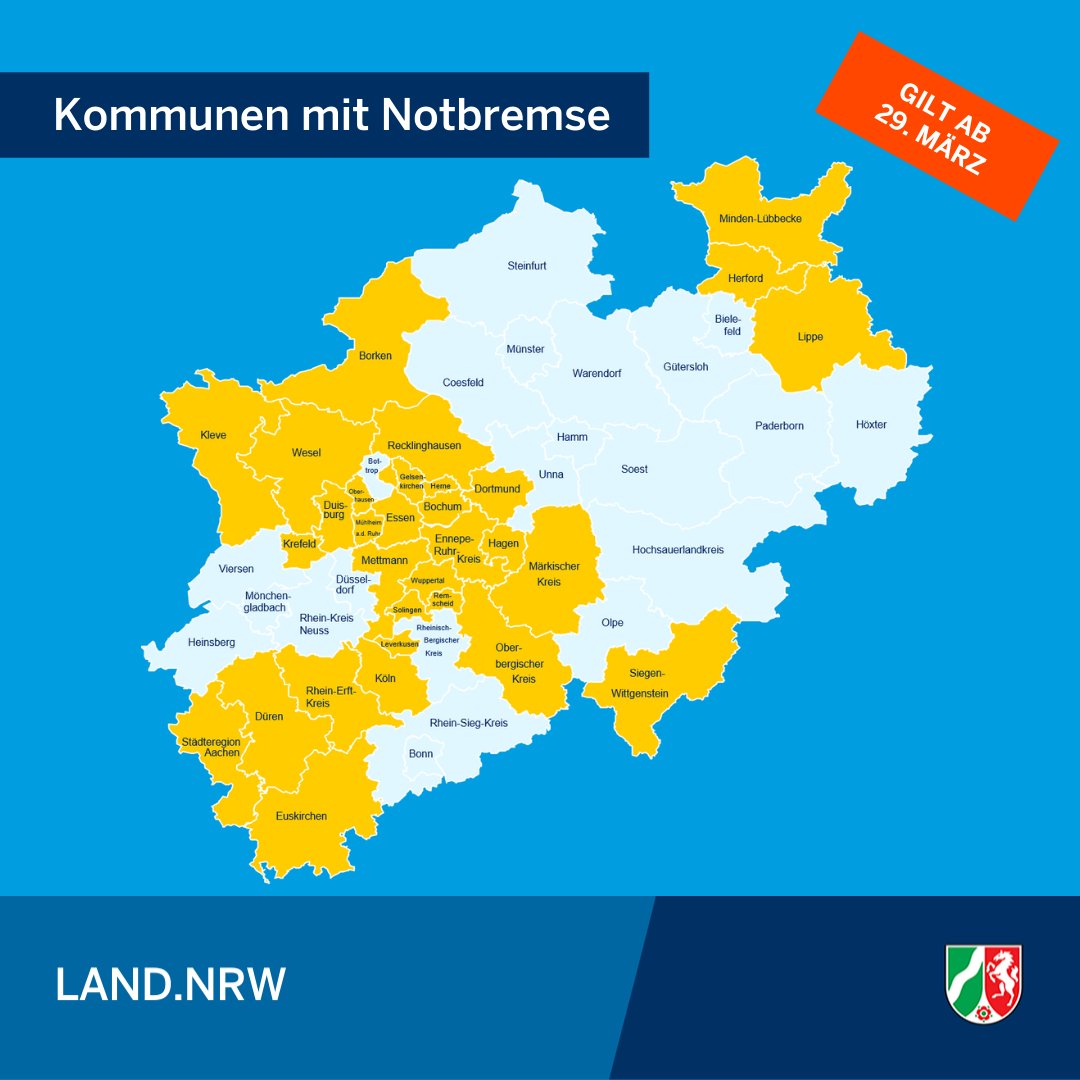 Mit Blick auf die landesweite 7-Tages-Inzidenz von 121,6 (Stand: 26. März 2021) greift auch in Nordrhein-Westfalen grundsätzlich die bundesweit vereinbarte Notbremse: in allen Kreisen und kreisfreien Städten mit einer Inzidenz über 100 werden die zum 8. März 2021 vorgenommenen Öffnungen wieder rückgängig gemacht.