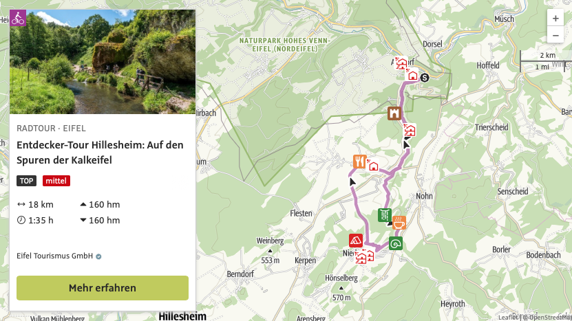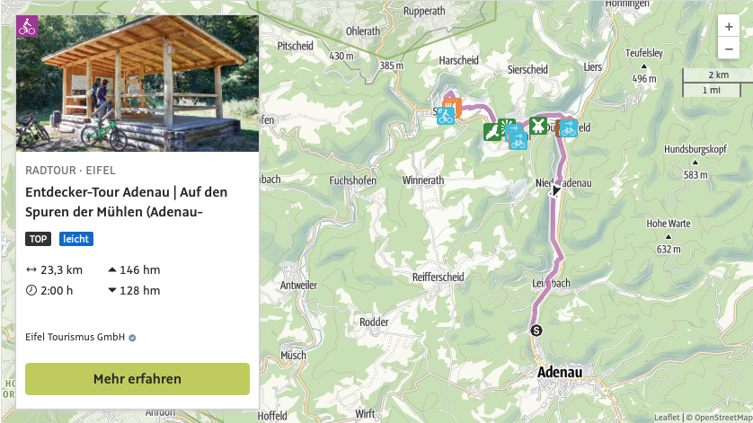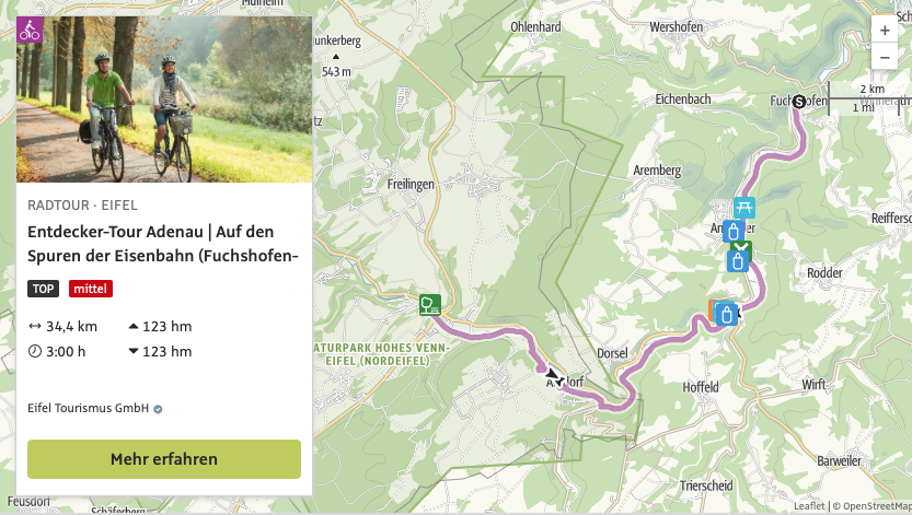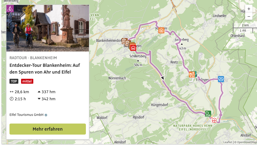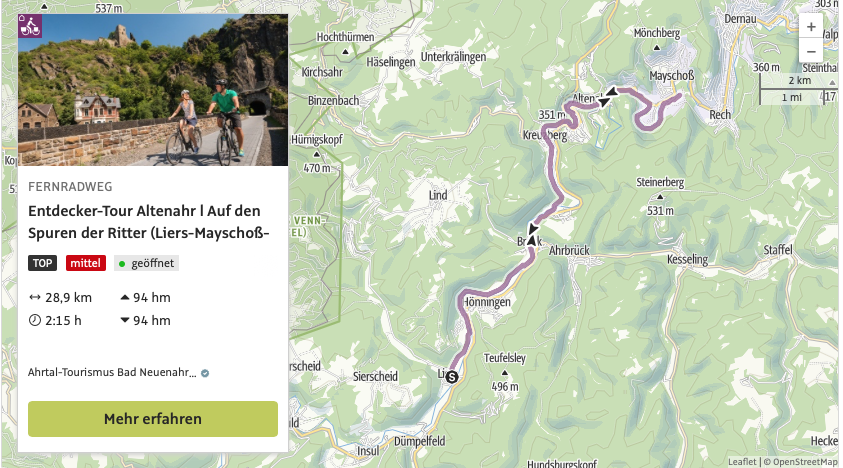 Die „Entdecker-Touren“ führen über ausgewiesene Radwege, haben eine Anbindung an den Ahr-Radweg und somit an die Strecke der Tour de Ahrtal. Insgesamt stehen fünf „Entdecker-Touren“ zur Auswahl.