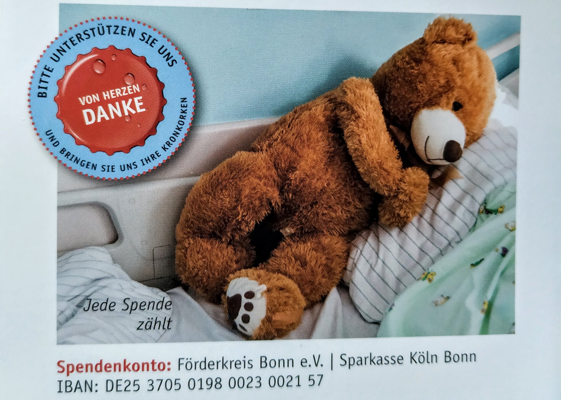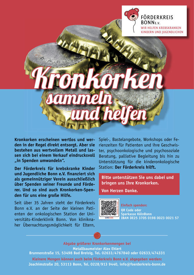 Der Förderkreis für krebskranke Kinder und Jugendliche Bonn e.V. finanziert sich dabei als gemeinnütziger Verein ausschließlich über Spenden seiner Freunde und Förderer, auch über Kronkorken-Spenden.