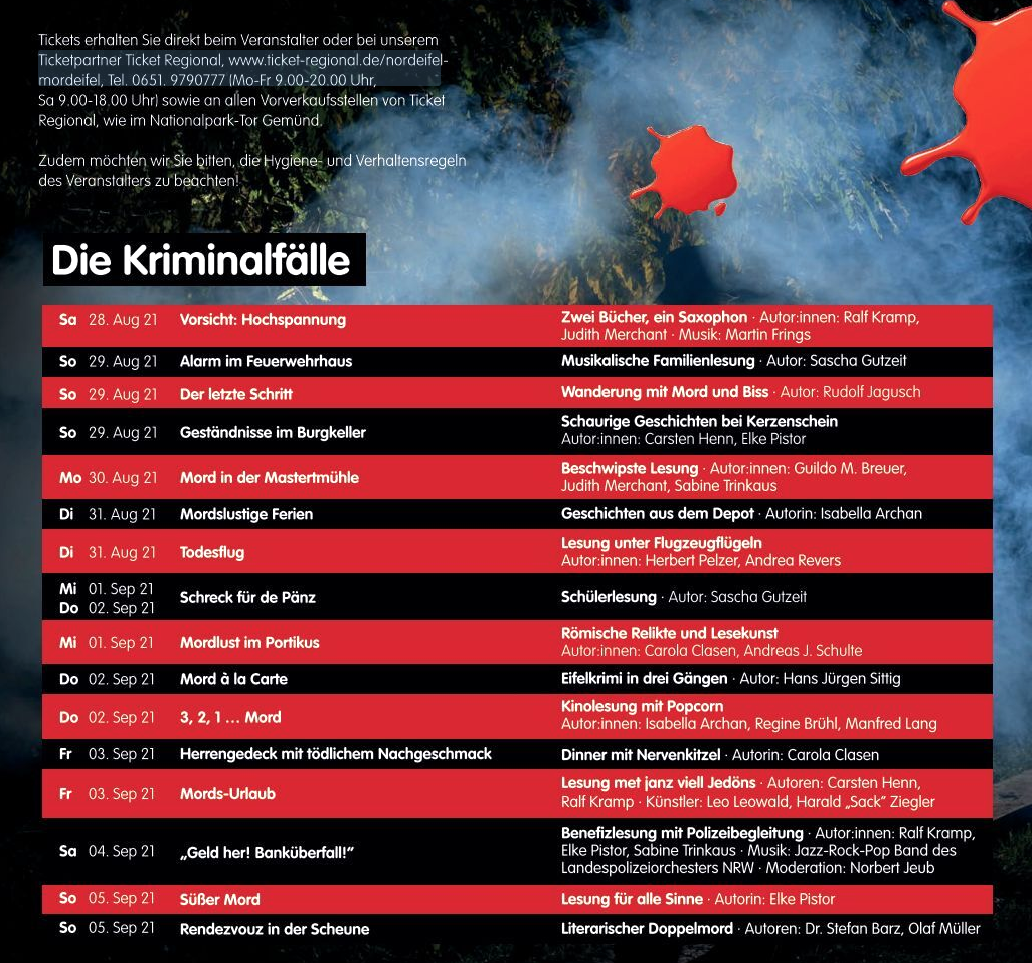 Die Nordeifel Tourismus GmbH und der Förderverein Eifelmuseum e.V. bieten gemeinsam mit ihren Partnern beim Krimifestival „Nordeifel-Mordeifel 2021“ neun Tage Spannung mit 17 verschiedenen Eifel-Krimiautoren, dem Meister des schwarzen Krimi-Humors Ralf Kramp, der gebürtigen Gemünderin und Mediendozentin Elke Pistor, der Spiegelbestseller-Autorin Judith Merchant, dem Weinjournalist Carsten Sebastian Henn, der Autorin und Schauspielerin Isabella Archan, der Weltenbummlerin Sabine Trinkaus und vielen mehr.