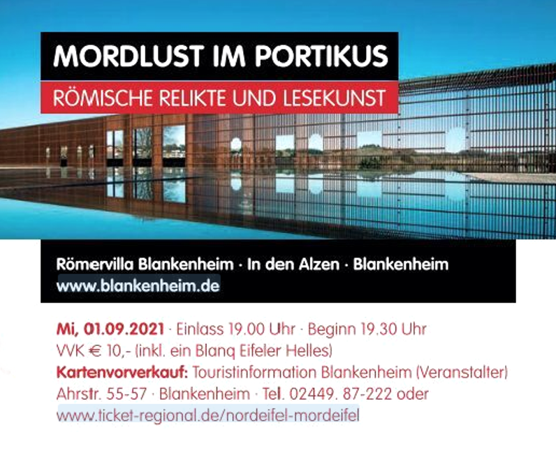 "Unheimliches passiert in der Nordeifel"- Nachdem das beliebte Krimifestival "Nordeifel-Mordeifel" im letzten Jahr ausfallen musste, kann man in diesem Jahr glücklicherweise in der vermeintlich idyllischen Landschaft der Nordeifel wieder auf charmant-komische Ermittler, bedrohliche Gauner und schlitzohrige Schurken treffen. Im Rahmen der 9tägigen Veranstaltungsreihe kann man vom 28. August bis zum 5. September an ungewöhnlichen Orten, u.a. an der Römervilla in Blankenheim ("Mordlust im Portikus") Eifel-Krimiautoren kennenlernen und dabei einiges erleben. Jetzt schnell Tickets sichern!