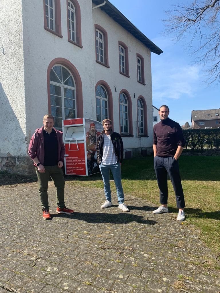 (von rechts: Fabian Giefer und Manuel Sanz zusammen mit Landrat Markus Ramers vor der „Alten Schule”)