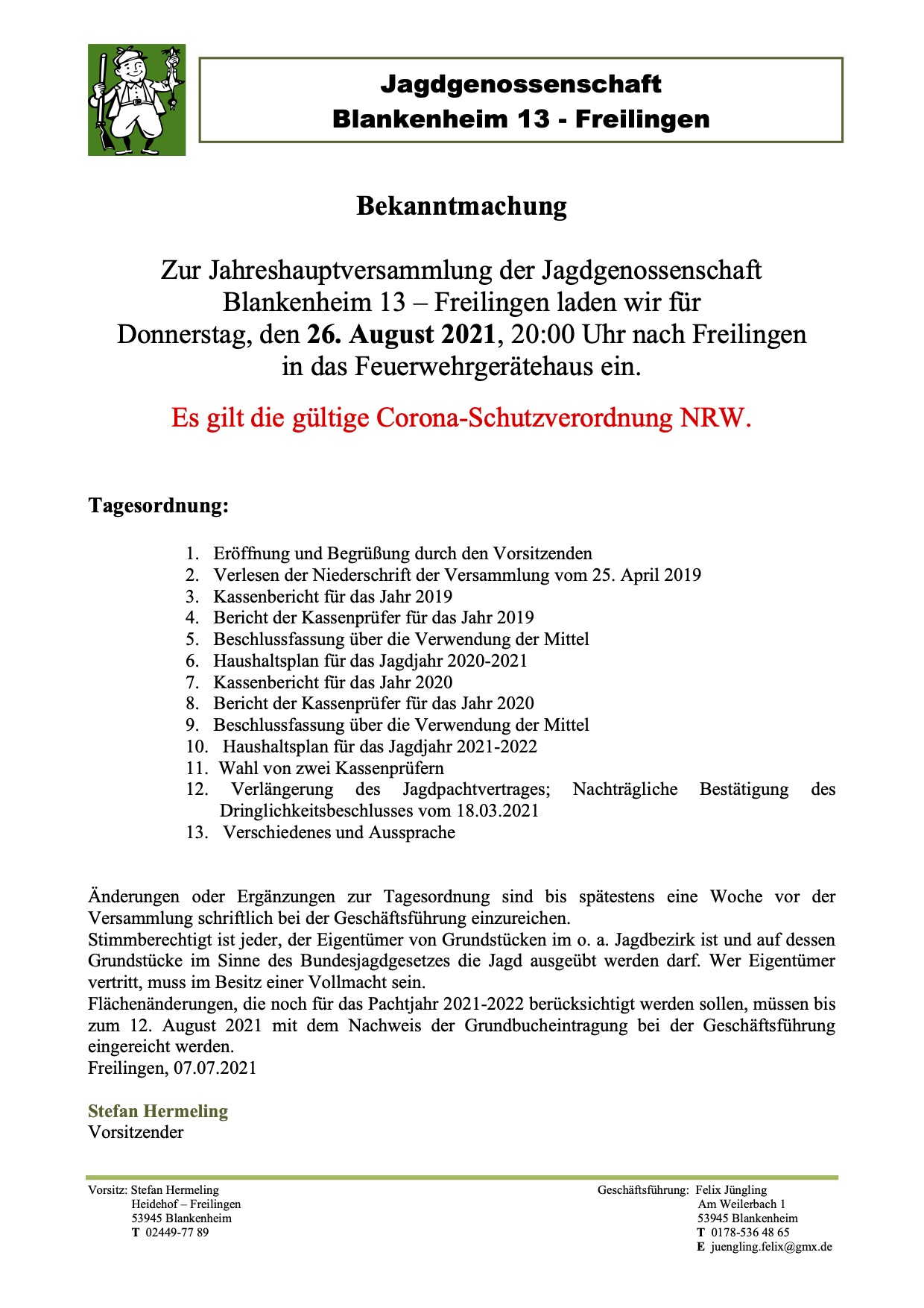 Zur diesjährigen Jahreshauptversammlung der Jagdgenossenschaft Blankenheim 13 - Freilingen am Donnerstag, 26. Augst 2021 um 20.00 Uhr lädt der Vorsitzende, Stefan Hermeling alle Jagdgenossen in das Feuerwehrgerätehaus in Freilingen ein. Auf der Tagesordnung stehen u.a. die Beschlussfassung über die Mittelverwendung und den Haushaltsplan.