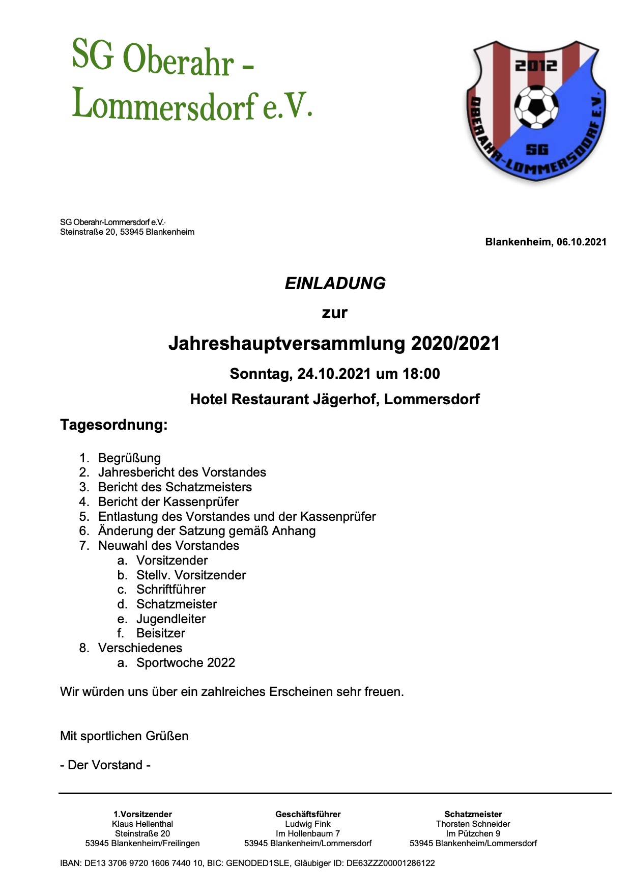 Am Sonntag, 24. Oktober hält die SG Oberahr-Lommersdorf e.V. im Jägerhof in Lommersdorf die Jahreshauptversammlung für 2020/2021 ab, bei der ab 18.00 Uhr u.a. eine Satzungsänderung auf der Tagesordnung steht. Dazu sind alle Mitglieder herzlich eingeladen.