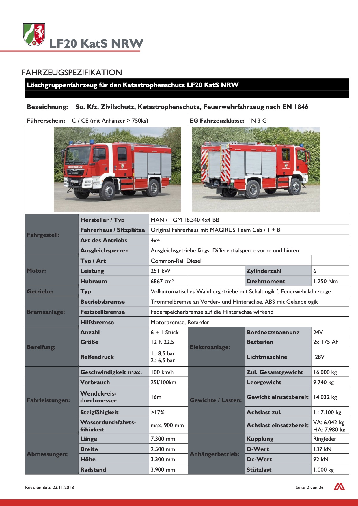 Der Katastrophenschutz ist eine Aufgabe des Bundes und der Länder. Nordrhein-Westfalen investiert 2021 (und damit bereits vor der Flutkatastrophe entschieden) massiv in den Katastrophenschutz: Das Institut der Feuerwehr Nordrhein-Westfalen, die größte Feuerwehrausbildungseinrichtung in Deutschland, hat im Auftrag des nordrhein-westfälischen Innenministeriums in diesem Jahr 109 völlig identische Fahrzeuge vom Typ Magirus LF20-KatS auf MAN TGM 18.340 BB 4x4 in Euro-6-Ausführung mit Allison-Vollautomatikgetriebe der 3000er Baureihe beauftragt. Dabei handelt es sich um das bisher größte Beschaffungsprojekt für Feuerwehrfahrzeuge des Landes NRW.