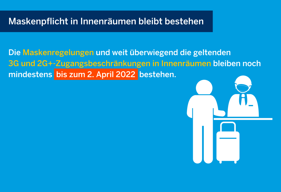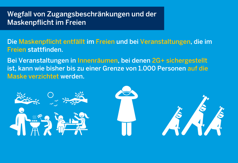 Maskenregelungen in Innenräumen bleiben bestehen, im Freien entfällt die Maskenpflicht. Für besonders risikobehaftete Einrichtungen (Krankenhäuser, Pflegeheime, Justizvollzugsanstalten) wurden die im Bundesgesetz jetzt weggefallenen bisher bundeseinheitlichen Vorgaben in der Landesverordnung übernommen.
