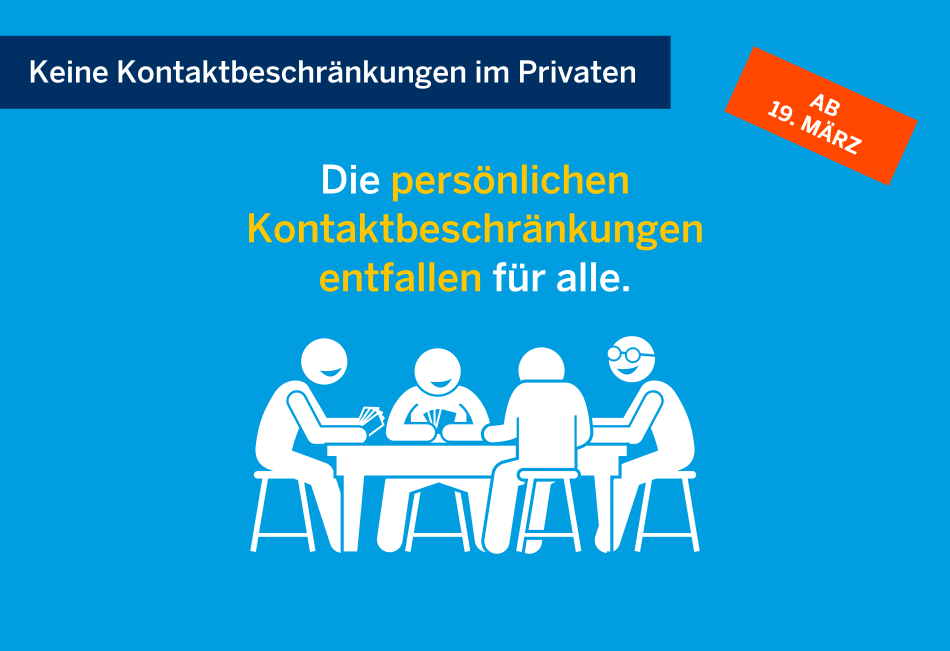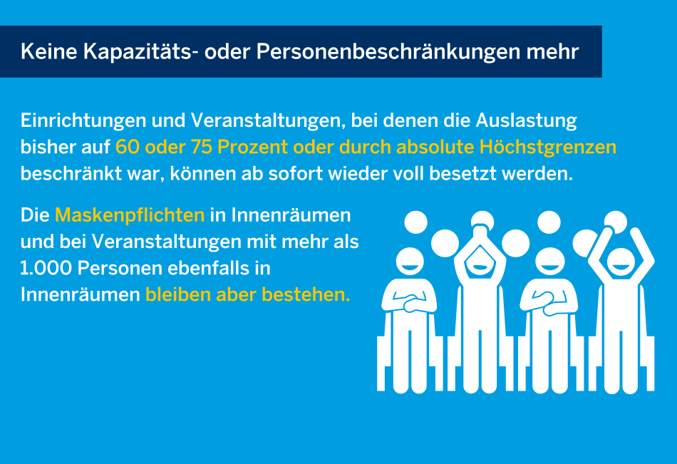 Für andere Beschränkungen, die bisher in der Landesverordnung geregelt waren, gibt es auch nach Maßgabe der Übergangsregelung des geänderten Infektionsschutzgesetzes keine Rechtsgrundlage mehr, sodass persönliche Kontaktbeschränkungen für nicht immunisierte Personen (private Treffen bisher nur mit eigenem Haushalt oder max. zwei Personen aus einem weiteren Haushalt) sowie Zugangsbeschränkungen für Versammlungen wegfallen. Auch die prozentualen Kapazitätsbegrenzungen und festen Personenobergrenzen für Einrichtungen und Veranstaltungen entfallen, so zum Beispiel für den Besuch von Sportveranstaltungen. Diverse Zugangsbeschränkungen (etwa für Jugendarbeit, Sport im Freien und Versammlungen, Trauungen und Feiern in Privaträumen) werden aufgehoben.