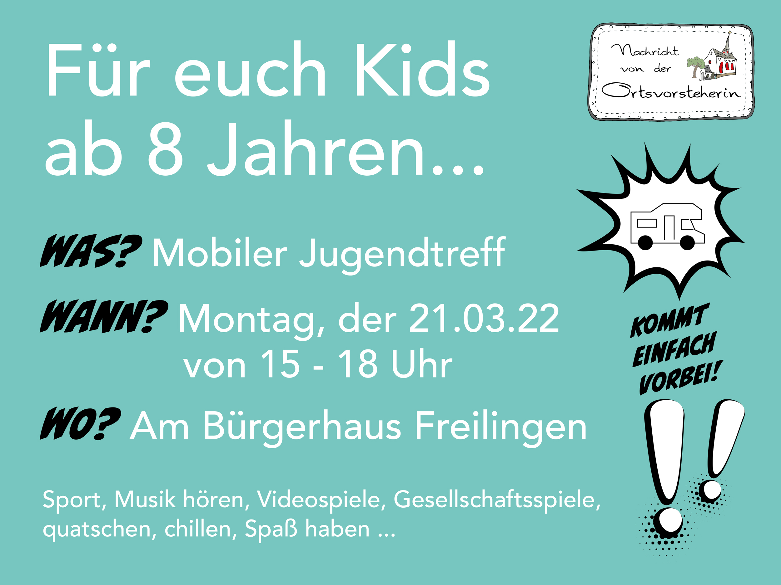 Der mobile Jugendtreff "Jumpa4you" macht am Montag, 21. März von 15.00 bis 18.00 Uhr am Bürgerhaus in Freilingen Station. Der umgebaute Kleintransporter bietet Sitzgelegenheiten für drinnen und draußen, verschiedene Medien (Musikanlage, Mischpult, Kamera, etc.) freies Internet und diverse Spiel- Sport- und Beschäftigungsmaterialien. Einfach mal vorbeischauen!