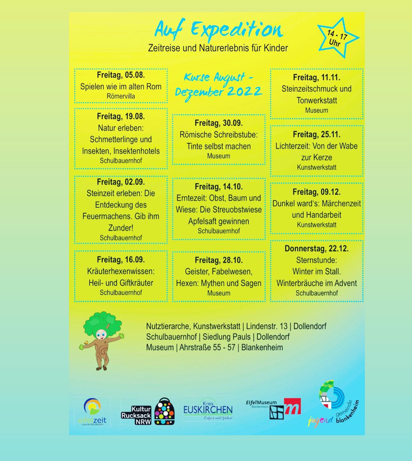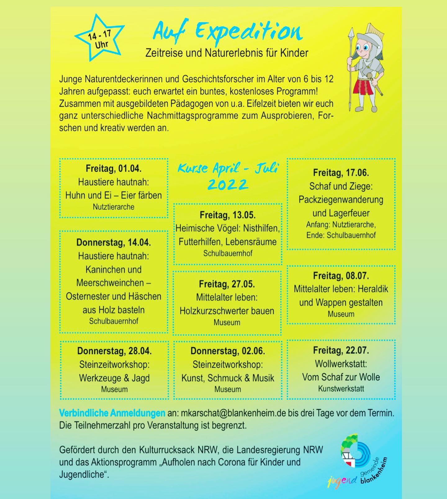Junge Naturentdecker und Geschichtsforscher im Alter von 6 bis 12 Jahren aufgepasst: am 1. April startet das diesjährige kostenlose Kinderprogramm im Eifelmuseum mit vielen unterschiedlichen Angeboten. Zusammen mit ausgebildeten Pädagogen von u.a. Eifelzeit stehen abwechslungsreiche Nachmittagsprogramme zum Ausprobieren, Forschen und kreativ werden auf dem Programm. Da ist garantiert für jeden etwas dabei ! Hier eine Übersicht über das Angebot in den nächsten Monaten!