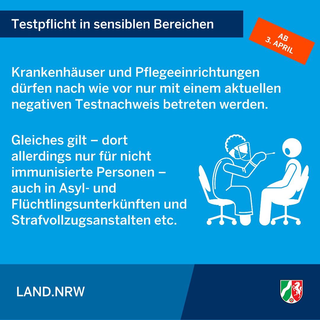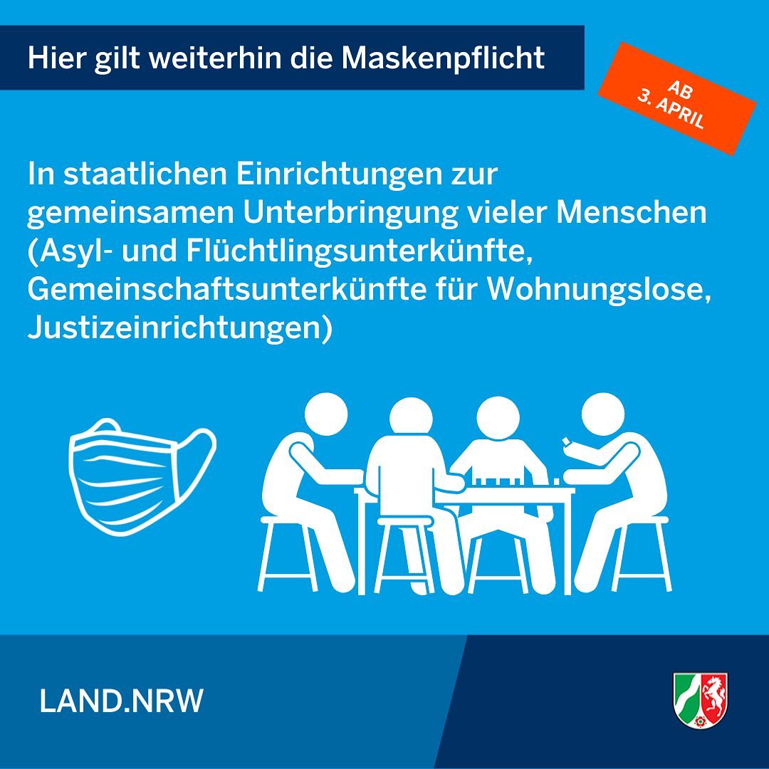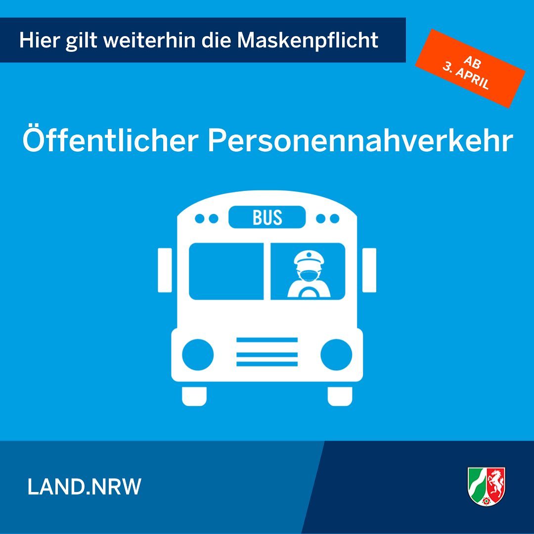 Maskenpflicht entfällt weitestgehend... Das Gesundheitsministerium Nordrhein-Westfalen hat die Coronaschutzverordnung an die Vorgaben des Bundesinfektionsschutzgesetzes angepasst. Damit werden ab Sonntag, 3. April die Corona-Schutzmaßnahmen in NRW erheblich reduziert. Die bisherigen 3G und 2G+ Zugangsbeschränkungen sowie die allgemeine Maskenpflicht in Innenräumen entfallen. Bestehen bleiben Masken- und Testpflichten in besonders sensiblen Bereichen wie etwa Arztpraxen, Krankenhäusern oder ÖPNV.